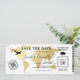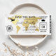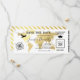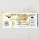 Carte d'embarquement pour les diplômés enregistrez l'invitation de billet de date avec une élégante carte du monde de destination de feuille d'or, boussole, avion, casquette diplômé, et un modèle de texte personnalisé.
