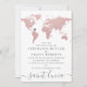 Invitation de mariage de destination de carte du monde rose pâle atténuée avec un marqueur d'emplacement en forme de cœur que vous pouvez déplacer pour marquer votre lieu de mariage et créer une invitation élégante sur le thème de voyage rose et gris pour une réception à domicile ou un mariage de destination.