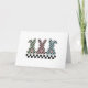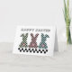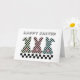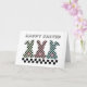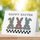 This playful Easter bunny greeting card has a cute and playful checkerboard design with the rear profile of 3 cute bunnies and their cotton tails, decorated in a checkerboard pattern. Each bunny is a different color alternated with black squares: mint green, pink, and a soft blue-teal color. The text Happy Easter appears above the 3 bunnies in a playful font, with a strip of classic black and white checkerboard squares. On the inside, underneath some colorful checkerboard eggs, the greeting says "Wishing you a Hoppy Easter and an egg-stra special day." You can edit the text if you want or add your own signature using the Zazzle tools.