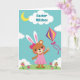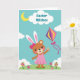 This card features a flat, colorful illustration of a smiling brown, human-like animal character with rosy cheeks, wearing a simple pink outfit and tall white bunny ears 🐰. It holds a striped decorated egg in teal, yellow, and pink close to its chest, like a small gift meant for someone special. Behind it, a light blue sky is dotted with soft white clouds and a bright yellow crescent moon, giving the scene a calm, dreamy feel. Near the top, the words “Easter Wishes” sit inside a cloud shape in friendly, thick lettering, set in a bright, easy-to-read color. A diamond-shaped kite in magenta, yellow, and purple drifts overhead, with a long pink ribbon that curls as if pulled by a gentle breeze. Below, a green grassy hill is sprinkled with pinwheel-like flowers in mixed colors 🌷, adding a sweet, shared-outing mood to the setting. Off to the side on the grass, a second decorated egg rests near the flowers with small patterned details and soft pastel accents.