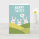This card features a soft pastel scene with a calm light-blue sky across the top and rounded white lettering that reads “HAPPY EASTER” centered near the upper edge. Below, rolling hills in gentle green and muted yellow curve across the page like layered blankets. Three small white bunnies peek up from behind the hills 🐰, their dot eyes and rosy cheeks giving them a shy, friendly look as they lean toward one another. Their long ears stand upright with pale pink inner details, adding a sweet sense of attention, like they’re listening for a familiar voice. The middle bunny holds a white speech bubble that floats slightly above its head, as if it’s greeting a close friend. Inside the bubble, the word “Hi!” appears in bright red, drawing the eye to the center of the scene 🌷. Tiny curved smiles sit low on each face, and the rounded hill edges frame the trio like a cozy hiding spot.