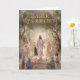 Celebrate the gentle triumph of Easter with this serene card featuring a pastel painting of Jesus standing just outside the open tomb, arms raised in quiet victory as soft glory glows behind Him. Awestruck people gather near, their faces bathed in hues of dawn pink, lavender, and pale gold, capturing the tender miracle of resurrection hope. Inside, graceful poetry traces the mystery of life rising from silence, calling every heart to lift up in joy and wonder at the Lamb who makes all things new.