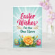 This card features a spring-themed digital illustration that pairs a romantic message with garden details 🌷. Across the upper half, the words “Easter Wishes” sit large in fuchsia lettering, curving gently as if floating in the air. Just below, “for the One I Love” appears in softer green text, nestled between small golden flourishes that feel like a delicate frame. In the lower section, a fully opened golden-yellow rose takes center stage, its layered petals drawn to look plush and velvety, like something you’d lean in close to admire. Around it are lush green leaves, tiny white and pink blossoms, and slim yellow buds that read like early spring growth. Three glossy egg-shaped decorations sit nearby, one with orange and teal stripes, one in calm teal with faint floral markings, and one with pink and red bands 🐇. Behind everything, a sky-blue gradient fades outward while soft white rays spread from the top, and the gold accents catch the light with a gentle sheen.