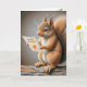 Un écureuil est perché sur une branche d'arbre, apparemment absorbé par une carte d'anniversaire