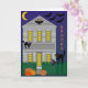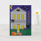 Carte Halloween illustrée. Encore des chats ! Une maison détaillée avec une clôture de piquetage semble être au centre des activités de ces nuits !