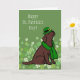 Carte de voeux élégante de Labrador de chocolat du jour de St Patrick. Conception unique et drôle de bande dessinée de labrador retriever créée par Naomi Ochiai du Japon. Chocolat mignon et élégant Labrador célébrant le casquette vert irlandais de port de lutin du jour de St Patrick heureux et l'écharpe verte. Cadeaux gentils de Labrador pour les amoureux de les chiens irlandais qui possèdent le chocolat Labradors ! ! Motif chanceux de trèfle de quatre feuilles à l'arrière-plan.