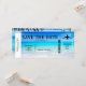 Une belle image de plage est l'arrière - plan de ce mariage de destination de carte d'embarquementEnregistrer la date. Une destination amusante conception personnalisée de mariage. Plage tropicale avec bleu aqua et texte moderne.