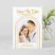 Save The Date White Gold Stylish Script Art Deco Wedding Cards présente votre photo préférée dans une arche dorée sur un arrière - plan blanc. Personnalisez avec votre texte en modifiant le texte dans les zones de texte fournies. Conçu pour vous par ©Evco Studio www.zazzle.com/store/evcostudio