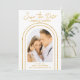 Save The Date White Gold Stylish Script Art Deco Wedding Cards présente votre photo préférée dans une arche dorée sur un arrière - plan blanc. Personnalisez avec votre texte en modifiant le texte dans les zones de texte fournies. Conçu pour vous par ©Evco Studio www.zazzle.com/store/evcostudio