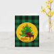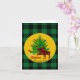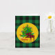 Cartes de vœux pliées festives rustiques avec élan et sapin de Noël, nom de famille personnalisé et signatures personnalisées soulignées d'un motif à carreaux de bison vert et noir.