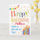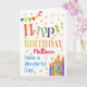 Un coloré, texte a basé la carte d'anniversaire pour que vous customisiez avec le nom du destinataire, avec l'étamine de point de polka, les bougies lumineuses et rayées de gâteau d'anniversaire et arrosé avec des étoiles d'or-effet. Le texte modelé indique, le "joyeux anniversaire" et là est également "ont un jour merveilleux !" dans le lettrage bleu (la NOTA: les étoiles et les contours d'effet d'or sera comme vue et ne sera pas imprimée en encre métallique.)