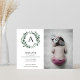 Carte Faire-part de naissance fille Monogramme Wreath. Annoncez votre lot de joie avec cette jolie carte de faire-part en monogramme de couronne verte. Customisez avec la photo de votre bébé, modifiez le filtre de la photo, changez les polices et les couleurs de police, et ajoutez les propres informations de votre petit pour personnaliser cette carte avec vos touches spéciales.