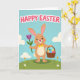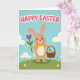 This card shows a sweet upright rabbit 🐰 in warm tawny tones, with pink inner ears, rosy cheeks, and a wide smile that feels like it’s meant for someone special. A small yellow bow tie sits at its neck, adding a friendly, dressed-up touch as it stands on a green grassy hill sprinkled with white daisies and tiny orange flowers. In one paw it holds a tall purple tulip 🌷, angled like a gentle offering, while the other paw supports a woven basket tucked close like a thoughtful gift. The basket is filled with decorated eggs in bright colors, including blue-and-white stripes, yellow swirls, and pink wavy lines that suggest careful attention and affection. Across the top, a large seasonal greeting appears in pink letters with a white outline, centered high in the sky for easy reading. Behind the character, the background is a pastel blue sky with a few rounded white clouds drifting above the hill. The tulip’s purple bloom stands out crisply against the soft sky, with the green stem running straight up beside the rabbit’s smiling face.