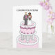 Une mariée multiraciale et un marié debout sur un gâteau géant rose et blanc. Le mot "Félicitations" accompagne l'image, qui a un arrière - plan blanc.