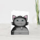 Un chaton sournois en noir et gris tenant une souris en jouet sur une carte de notes qui est libellée comme une carte de félicitations amusante pour un nouveau propriétaire de chat.