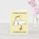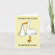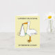 Illustration simple d'une cigogne tenant un bébé dans une feuille blanche qui est suspendue au bec. L'image a un arrière - plan de couleur citron et est accompagnée des mots "Félicitations de devenir cousin".