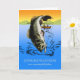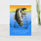 Félicitations à un père/à papa sur sa retraite. La scène vintage de pêche avec le rétro bateau en bois, le pêcheur deux, la grande basse de bouche, le coucher du soleil, et grand éclabousse dans l'eau de lac. Collines vertes floues dans la distance lointaine. Art, image, et studios de Shoaff Ballanger de © de copyright de vers.