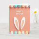 Designed with a soft peach background, this overhead layout feels like a warm spring note shared between close friends 🌷. Along the top and bottom edges, rows of egg-shaped decorations form a gentle frame, like two people mirroring each other’s care with matching details. Each glossy shape carries small polka dots or neat stripes in pastel light blue, orange, yellow, and white, creating a calm, cheerful rhythm. Centered in the middle, raised white text sits prominently, with subtle shadows that make it look slightly lifted from the page. Just beneath the words, a pair of simple bunny ears appears in white outline with a peach-toned inner area, adding a sweet, affectionate touch 🐰. The lighting and soft shading under every element give the scene depth while keeping the arrangement uncluttered and easy on the eyes. The message is placed squarely at center in white, with the ears aligned directly below it, and the patterned eggs evenly spaced along the top and bottom borders. The egg shapes gleam softly against the peach field, with tiny shadows falling just below each one.