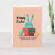 This card features a cute long-eared bunny in soft light teal 🐰, peeking out of a bright red gift box tied with a deep green ribbon and a neatly looped bow. The bunny’s eyes are closed in a gentle smile, with a rosy blush that feels like a shy, affectionate moment shared with someone close. Around the box, several decorated egg shapes float like a friendly circle of little surprises, adding a sense of togetherness to the scene. The eggs show sunny yellow stripes, turquoise polka dots, pale pink diagonal lines, and a rich magenta swirl, each pattern looking like a small note passed between friends. A warm peach background keeps everything cozy and lets the reds, greens, and pastels stand out without feeling harsh. A flowing cursive-style message sits near the top and bottom in a dark contrasting color, framing the illustration with an easy, romantic touch 🌷. The shading is light and smooth, and the green bow on the box has crisp loops and trailing ribbon ends.