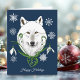 Un loup blanc arctique aux fleurs de neige dessinées dans un style Art nouveau. Un fond bleu foncé et des flocons de neige derrière et autour du loup arctique.