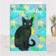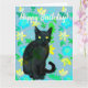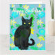 Peinture aquarelle d'un chat noir, fleurs en arrière-plan, Joyeux Anniversaire !