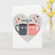 This design shows two cute anthropomorphic mugs standing close together, one in dark grey and the other in blush pink, leaning in like close friends or sweethearts 🥰. Their wide white eyes and small, upturned smiles face forward, giving the scene a gentle, happy energy that reads as affectionate without trying too hard. A large muted-grey heart outline sits behind them like a soft frame, wrapping the pair in a quiet, cozy embrace ❤️. Near the top, the words “FOREVER LOVE” are placed above the mugs in dark grey, easy-to-read letters that balance the illustration. Around the couple and the headline, small hearts drift and scatter in red, light pink, and dark grey, adding motion and a light romantic sparkle. The background stays simple with soft pastel tones and subtle shading, keeping attention on the mugs and the heart shapes. The overall layout centers the mugs inside the big heart, with the smaller hearts sprinkled mostly around the upper half and sides. The dark grey mug sits on the left and the pink mug on the right, with tiny hearts floating around them and the headline at the top.