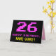 La façade de cette carte de voeux amusante, geek et naïve sur le thème de l'anniversaire comporte un grand nombre de "26" et le message "HAPPY BANTHDAY", rose coloré, ainsi qu'un nom de destinataire personnalisé jaune audacieux. Le texte a une apparence inspirée de celle des graphismes classiques de jeux vidéo/ordinateur de style 8 bits des années 1970 et 1980, et le arrière - plan est noir de couleur. L'intérieur a un message de salutation d'anniversaire customisé, ou peut-être pourrait-il être effacé et laissé vide si un message doit être écrit à la main à la place. Une carte d’anniversaire personnalisée comme celle-ci pourrait être une façon amusante d’envoyer un message célébrant le vingt-sixième anniversaire de quelqu’un. [~Z0000478]