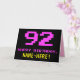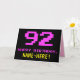 La façade de cette carte de voeux amusante, nauséabonde et geek sur le thème de l'anniversaire comporte un grand numéro rose "92", ainsi que le message "HAPPY BANTHDAY," en rose, et un nom de destinataire personnalisé jaune gras. Le texte présente un look inspiré de celui du jeu vidéo classique de 8 bits et des graphismes de jeux vidéo de 1970 et 1980, et le arrière - plan est noir de couleur. L'intérieur a un message de salutation d'anniversaire customisé, ou peut-être pourrait-il être effacé et laissé vide si un message doit être écrit à la main à la place. Une carte d’anniversaire personnalisée comme celle-ci pourrait être une façon amusante d’envoyer un message célébrant le quatre-vingt-douzième anniversaire de quelqu’un. [~Z0000478]