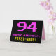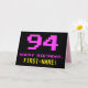 La façade de cette carte de voeux d'anniversaire amusante, nerveuse et geek comporte un grand nombre de "94" et le message "HAPPY BANTHDAY", rose coloré, ainsi qu'un nom de destinataire personnalisé jaune gras. Le texte a une apparence inspirée de celle de jeux vidéo et de jeux vidéo classiques de style 8 bits des années 1970 et 1980, et le arrière - plan est noir de couleur. L'intérieur comporte un message de salutation d'anniversaire personnalisé, ou peut-être pourrait-il être effacé et laissé vide si un message doit être écrit à la main à la place. Une carte d’anniversaire personnalisable comme celle-ci pourrait être une façon amusante d’envoyer un message pour célébrer le quatre-vingt-quatorzième anniversaire de quelqu’un. [~Z0000478]