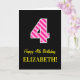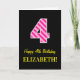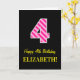 L'avant de cette carte de voeux amusante et simple sur le thème de l'anniversaire comporte un grand numéro "4" avec un motif rose foncé et rose clair rayures, avec le message "Happy 4th Birthday," et un nom modifiable. L'arrière - plan du devant est noir de couleur. L'intérieur comporte un message de voeux d'anniversaire modifiable, ou peut-être pourrait-il être effacé et laissé vide si un message doit être écrit à la main à la place. Une carte d'anniversaire personnalisée comme celle-ci pourrait être une façon amusante d'envoyer des voeux d'anniversaire à quelqu'un qui célèbre son quatrième anniversaire. [~Z0000377]