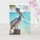 Un pélican portant des lunettes de soleil se dresse en toute confiance sur une jetée en bois qui s'empile au bord de la mer pour un 75ème anniversaire. Tout le texte peut être modifié.
