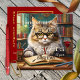 Carte d'anniversaire avec un chat mignon avec lunettes ( : -) ) dans une bibliothèque ou une chambre avec beaucoup de livres. Ajoutez vos propres textes drôles (ou autres). Sur le dos est un élégant design rouge bordeaux avec la même image encadrée d'or. Magnifique pour tous les fêtes de la colline et un amoureux du chat et/ou du vin. Bien sûr parfait pour une dame de chat folle : -)