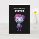 Carte d'anniversaire avec une jolie illustration. Monstre Frankenstein aux cheveux roses et violets et costume et cravate en dapper.