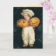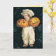 L'adorable garçon vintage tient deux citrouilles d'Halloween sculptés. L'un est heureux et l'autre est triste. Le texte sur les citrouilles dit salutations d'Halloween.