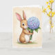 Designed with a gentle digital illustration style, the front shows a light-brown bunny with long ears and a fluffy white tail sitting on soft green grass 🐰. Its big dark eyes catch small highlights, and a tiny rosy nose and slight smile give it a sweet, friendly look, like it’s waiting to share a quiet moment. The bunny holds a rounded bouquet close to its chest, as if offering it with shy affection, the stems tucked neatly between its paws. The flowers form a full cluster that shifts from airy sky blue to pale lavender, with layered petals that look soft and full. Behind the scene is a creamy, watercolor-like background with faint texture and diffused light that keeps everything calm and tender. A short Easter greeting sits near the top in a simple, medium-size font, colored in soft lavender to match the blooms 🌷. Green leaves and sturdy stems fan outward beneath the bouquet, adding natural detail against the light backdrop.