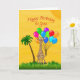 A bright and cheery birthday card for anyone with a yellow background and a giraffe holding a bunch of balloons and the words above "Happy Birthday to you"
