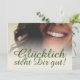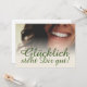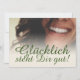 Glücklich steht Dir intestin ! Kompliment Karte mit lachendem Frauengesicht und handschriftlichen Grüßen auf der Vorderseite der Karte. Restliche Flächen stehen zur freien Verfügung.