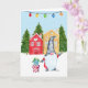 Cette carte de vacances est décorée d'un gnome debout à côté d'une tour de cadeaux devant de mignonnes maisons et un arrière - plan enneigé.