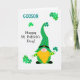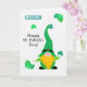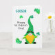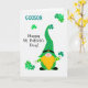 Une carte de voeux amusante pour votre filleul le jour de la Saint Patrick, avec un leprechaun mignon, tenant un shamrock. Le leprechaun a un très grand casquette, dans un motif vert, une grande barbe de gingembre, un nez énorme, des manches rayées, des chaussettes et des chaussures noires. En haut, en lettres vert foncé, est le mot "GODSON" et le message intérieur est facile à customiser ou à supprimer.