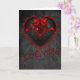 A dusky black lace background and a black lace heart with red lace frills, a large red jewel and big satin bow. A Romanti greeting card with a gothic touch.