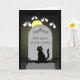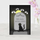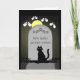 Un chat noir est assis énigmatiquement devant une pierre tombale sur une tombe au clair de lune. Il y a de tristes yeux fantômes autour de la pierre de tête et l'épitaphe dit : Nous avons de graves nouvelles, Dans la carte la légende dit : Votre gâteau d'anniversaire n'a pas réussi. Il a été écrasé par le poids des bougies. C'est une excellente carte pour les gens qui aiment faire des blagues sur l'âge à propos des anniversaires des gens.
