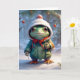 Adorable grenouille de Noël habillée en parka verte avec capuche blanche et foulard rouge.