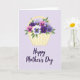 Designed with a stylized floral illustration, the card centers on a soft yellow basket with simple vertical lines hinting at a woven texture. The basket overflows with pansy-like blossoms in lavender, deep violet, blush pink, and white, each flower showing a dark center with a small yellow core that feels like a shared secret between close friends ❤️. Fresh green leaves peek through the bouquet, adding a just-picked look that brings a gentle, romantic warmth to the scene. The background is a muted lavender with a faint grid pattern that quietly frames the artwork without distracting from it. Beneath the flowers, a message sits in flowing deep purple lettering, placed low and centered to balance the basket above. Soft gradients and calm purples paired with cheerful yellows create an easy springtime mood, like a caring glance exchanged across the room 🌼. The text appears in deep purple near the bottom against the pale lavender background, with the basket and bouquet occupying the upper center.