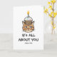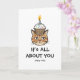 Célébrez leur anniversaire avec cette carte hilarante représentant un chat tigré grincheux visiblement peu impressionné. Le chat porte à contrecœur un cupcake d'anniversaire complet avec des paillettes et une bougie allumée sur la tête. Le texte sarcastique dit : "C'est TOUT À PROPOS DE TOI / aujourd'hui seulement."