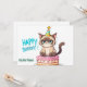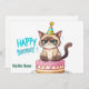 Celebrate birthdays with a humorous twist! This colorful cartoon card features a grumpy cat wearing a festive birthday hat, sitting atop a pink frosted cake with sprinkles. The cat’s piercing blue eyes and unimpressed expression add charm and humor to the design. A playful, slightly messy “Happy Birthday” sign hangs in the background, enhancing the celebratory feel.