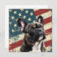 A watercolor portrait of a beautiful French Bulldog is placed against a grunge background of the USA flag. The back of this all occasion flat card has a text field for you to customize.