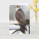 Un faucon sur une porte dans la neige. Une image craquante et pointue.