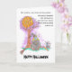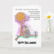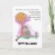 Dessin d'une sorcière qui a écrasé son balai dans un arbre à Halloween. La légende dit : "Attention cette année à Halloween - la sorcière s'est écrasée avec son bâton de brosse au moment où son masque faisait monter ses lunettes !" Personnalisez facilement cette carte en modifiant le texte modèle. Joyeux Halloween. Merci d'avoir vu mes dessins.