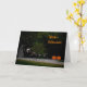 Carte éffrayante Halloween avec fantômes et squelettes dansants. La carte est sombre comme la nuit avec les citrouilles et les yeux dans le noir.