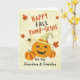 Joyeuse Pompe-Grins Automne. Un Jack o' Lantern avec un mignon grin et un casquette sorcier décore la couverture de cette carte de voeux d'Halloween pour grand-mère et grand-père. Customisez le texte inférieur sur la couverture au besoin. Copyright © Shoaff Ballanger Studios, 2022.